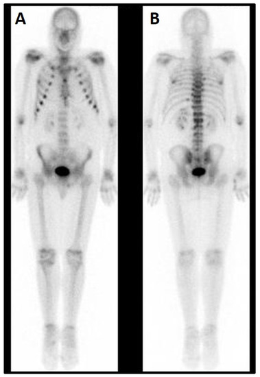 Total body scintigraphy (September 2015). (A) Front view. A Marked rosary sign at the chest. (B) Back view. Non-homogeneous spinal distribution of the tracer with increased uptake at the dorso-lumbar junction.