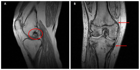 One year later, an MRI investigation showed an initial osteonecrotic area in the right knee and trabecular metaphyseal fractures of the distal femur and proximal tibia (Figure 2A,B), as well as healed distal tibial and ankle stress fractures (not shown).