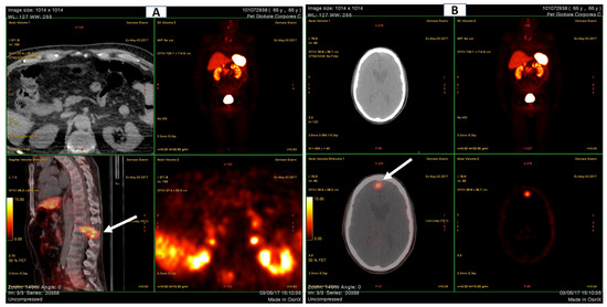 Global PET (Ga68-DOTATOC). (A) Spine. The white arrow indicates hypercaptation at T12/L1. (B) Skull. The white arrow indicates a focal area of increased uptake (max. axial diameter 13 mm).