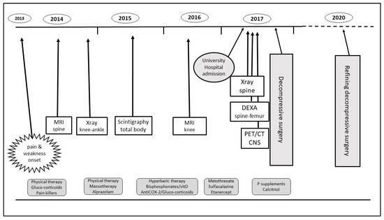 Initial orthopaedic and rheumatological assessments revealed mild osteoporosis and spondyloarthritis with discal spine bulging in L3–L5, cervical osteophytosis, and initial wedging at the dorsal level. Electromyography (EMG), MRI and doppler ultrasound of lower limbs were negative for neurological or vascular involvement. During the same year, the patient underwent a variety of physical therapy strategies including water and massotherapy without any benefit. He then manifested initial depressive symptoms and was treated with alprazolam.