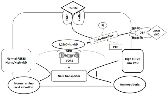 As early as the 1950’s, it was found that low levels of vitamin D were associated with aminoaciduria [8], and several observations supported the possibility that such association was mediated by PTH, known to enhance phosphate excretion and cAMP production and thereafter calcium reabsorption. It was only in 1989 [9] that it was found that aminoaciduria in vitamin D deficiency is independent of PTH and urinary cAMP levels. It was discovered that the actual site of the pathway was located in the apical membrane, the site of active amino acid accumulation. More recent acquisitions in molecular biology disclosed that aminoaciduria in vitamin D deficiency relates to a failure of upregulation of amino acid transporter synthesis [10]. In the presence of high levels of FGF23, the consequent low vitamin D may be responsible for the development of aminoaciduria. The pathway is schematized in Figure 6 [11]. The patient’s 1,25(OH)2vitD levels were very low. We are not aware of the exact moment when this condition began, although we can hypothesize that it persisted for quite a long time, provoking diffuse aminoaciduria.