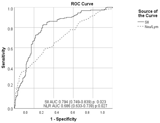 Effect of systemic immune inflammation index and neutrophil–lymphocyte ratio values on coronary thrombus burden (ROC analysis).