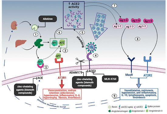 Schematic diagram of the effects of the RAAS system during SARS-CoV-2 infection and the proposed treatment. (1) Renin secreted by the kidney cleaves angiotensinogen, produced by the liver, to form AT1; (2) AT1 is converted to AT2 by pulmonary ACE. (3) AT2 binds to AT2R1 (angiotensin II receptors 1). The excess of AT2 through AT2R1 hyperactivation causes vasoconstriction, sodium retention (by aldosterone release), hypertension, inflammatory, IL-6, hypertrophy, fibrosis, and thrombosis. (4) SARS-CoV-2 binds to ACE2 to enter the host cell; however, the cellular protective response leads to ACE2 shedding. (5) ADAM17-regulated ectodomain shedding of ACE2 results in an increased amount of soluble and active ACE2 (sACE2). (6) AT1 and AT2 can also bind to sACE2. (7) They are then metabolized by ACE2 into Ag 1–9 and Ag 1–7, respectively. (8) The excess of Ag 1–9 and Ag 1–7 signaling via AT2R2 and MasR can induce vasodilatation, natriuresis, hypotension, anti-inflammatory effects, IL-10, lymphopenia, apoptosis, and thrombosis. (9) These events, in turn, produce a compensatory upregulation of both renin secretion and ACE activity, which establish the onset of a positive feedback loop. In the black boxes, drugs that can potentially stop the positive feedback loop by inhibiting enzymes of the RAAS are indicated. Dashed arrows indicate enzymatic activity, full arrows indicate non-enzymatic passage, and dashed blue arrows represent the positive feedback loop. Created in Bio-render.com. Reprinted from Ref. [42].
