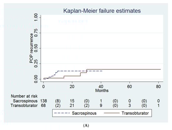 In our study, the least experienced surgeon (i.e., only three cases were performed by surgeon E) was a risk factor for POP recurrence (hazard ratio = 804.60, p < 0.001, Table 2). Similarly, Long et al. also reported that the POP failure rate was higher during the first 50 cases, compared with the subsequent cases (5% vs. 1.6%, p = 0.043) []. Price et al. reported that the majority of POP failures occur within the first three years following the initial operation []. Nonetheless, Nüssler et al. reported that the high POP recurrence rate was not due to insufficient experience of the surgeons performing the operation [].
