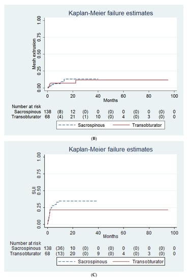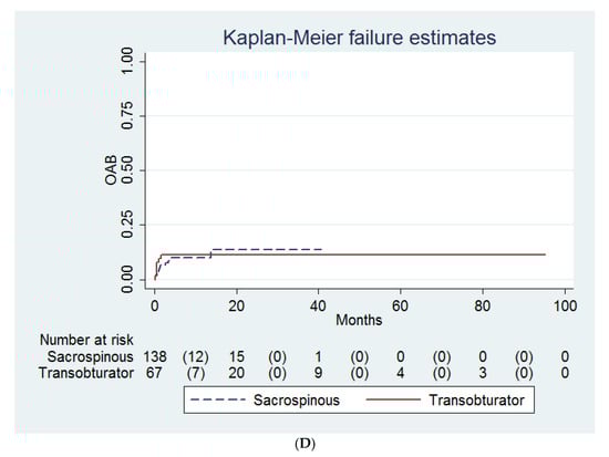 In this study, the method of POP reconstruction (i.e., sacrospinous versus transobturator mesh fixation) is not a predictor for POP recurrence, mesh extrusion, and postoperative SUI, OAB and VD (Figure 1A–D, Table 2, Table 3 and Table 4). Similarly, Lo et al. found that sacrospinous fixation (i.e., the Elevate system, American Medical Systems, Minnetonka, MN, USA) had a similar objective and subjective cure rate, compared with transobturator fixation (i.e., the Perigee system) []. Kato et al. also reported that the reoperation rates due to prolapse recurrence and mesh exposure rates did not differ between the Prolift-type (i.e., anterior mesh with transobturator arms, posterior mesh with sacrospinous arms) and Uphold-type (i.e., anterior mesh with sacrospinous arms) groups [].
