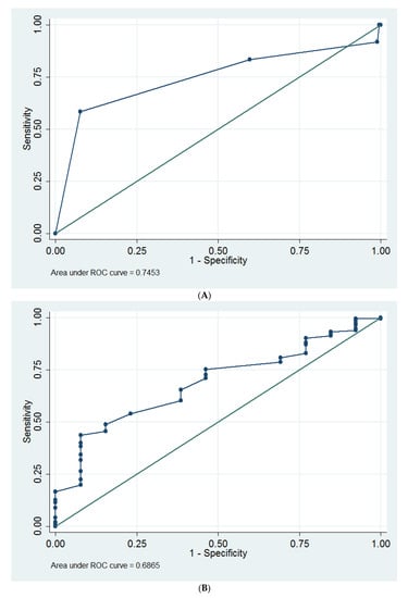 The receiver operating characteristic curves for (A) stage of cystocele as a predictor of recurrence of pelvic organ prolapse, and (B) age as a predictor of mesh extrusion.
