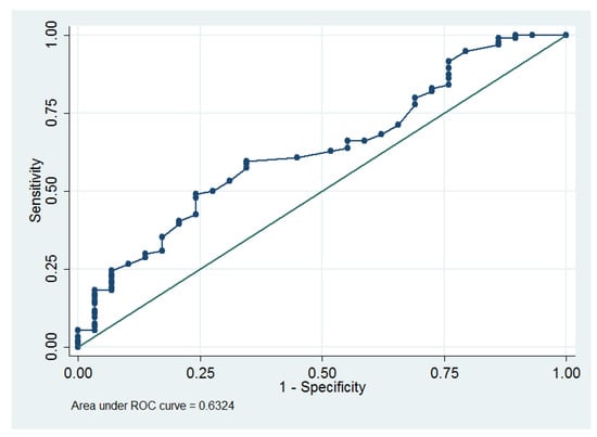 Multivariable Cox proportional hazards model also revealed that Qmax (hazard ratio = 1.03) was the sole predictor of postoperative SUI (Table 3). Qmax ≥ 19.2 mL/s was determined as an optimum cut-off value for predicting postoperative SUI, which had an area under the ROC curve of 0.59 (95% CI = 0.48 to 0.69; sensitivity = 62.5%, specificity = 55.1%, Figure 3).