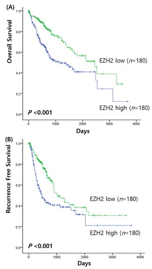 The analysis of clinical features showed that it was related to the degree of metastasis of lymph nodes, and it was also significantly related to an increase in the concentration of AFP. Previous studies have shown that AFP promotes invasion and metastasis in HCC [,,]. AFP is a representative biomarker for HCC, suggesting that elevated serum AFP concentrations (>20 ng/mL) correlate with an increase in the risk of HCC development []. Given this result, EZH2 expression seems to affect AFP elevation, inducing poorer prognosis. Although the exact mechanism is not known yet, the expression of EZH2 is thought to affect lymph node metastasis and deteriorate the prognosis of HCC. According to previous research, EZH2 upregulation was associated with HCC progression and multiple HCC metastatic features, including venous invasion, direct liver invasion, and the absence of tumor encapsulation []. In addition, the results of previous studies on the correlation between EZH2 and lymph node metastasis showed that the correlation was stronger for EZH2-expressing tumor cells in lymph nodes than for matched primary tumor cells []. Therefore, high expression levels of EZH2 were associated with the pathological grade of tumors and lymph node metastasis.