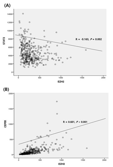 Quantitative correlation analysis was performed using clinical parameters. The gene-gene correlation analysis based on the TCGA data analysis showed that EZH2 expression was negatively correlated with STAT3 expression (R = −0.163, p = 0.002) (Figure 2A). We also examined the association between EZH2 and the CEP55 gene, a subgene of EZH2. The levels of expression of EZH2 and CEP55 were positively correlated (R = 0.601, p < 0.001) (Figure 2B).