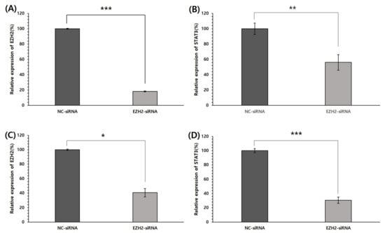 Reverse-transcription reactions were conducted using the ReverTra Ace qPCR RT Master Mix (TOYOBO, Osaka, Japan). The expression levels of EZH2, STAT3, and GAPDH were measured by RT-qPCR. RT-qPCR analysis was performed using a CFX Connect RT-PCR System (Bio-Rad, Hercules, CA, USA). The primers used for RT-qPCR were synthesized by Bionics (Seoul, Korea). The primer sequences used for RT-qPCR are listed in Table 1. The PCR amplification cycles were as follows: 95 °C for 10 min, followed by 40 cycles of 95 °C for 60 s and 72 °C for 30 s.