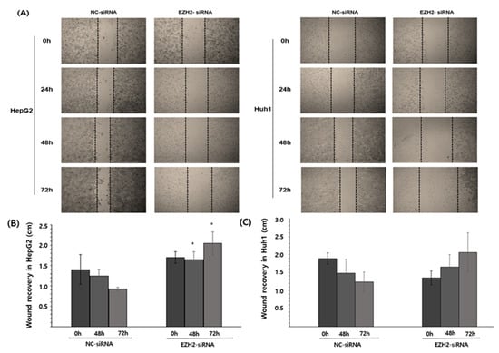Cells migration in cell scratch wound healing assay. EZH2 inhibited cell migration in HepG2. (A) Wound healing assay of HepG2 and Huh1 upon (200 nM) for 24 h, 48 h, and 72 h. The HCCs treated with NC-siRNA were used as control. (B) Quantification of wound area in control and EZH2 treated HepG2. (C) Quantification of wound area in control and EZH2 treated Huh1. * p < 0.05.