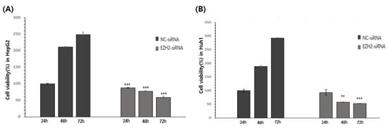 siRNA knockdown of EZH2 and growth of HCC cells. (A) Detection of cell viability after transfection in HepG2. (B) Detection of cell viability after transfection in Huh1. ** p < 0.01, and *** p < 0.001 by Student’s t-test.