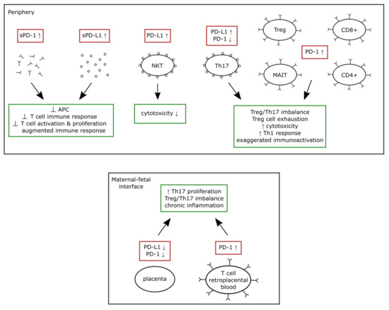 The following Figure 1 summarizes the described alterations of the PD-1/PD-L1 system seen in preeclampsia and their effects on the immune system.
