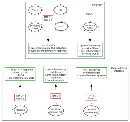 A blockade of TIM-3 results in an upregulation of pro-inflammatory cytokines as well as an accumulation of inflammatory granulocytes and macrophages at the maternal-fetal interface [41,43].