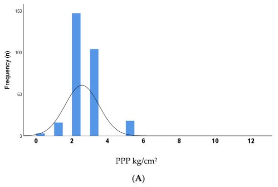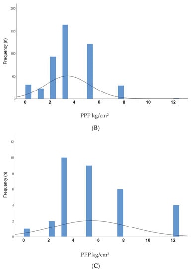 Figure 1 shows the frequency distribution curves for all PPP values (n = 792) recorded at specific plantar sites for all (n = 33) study participants, split into 3 sub-groups for analysis: (A) healthy control sites (n = 288); (B) diabetes sites without DFU history (n = 472); (C) diabetes sites with DFU history (n = 32). Median (IQR) PPP for the groups were: healthy control sites = 2 kg/cm2 (2–3.25); diabetes sites without DFU history = 3.25 kg/cm2 (2–5); diabetes sites with DFU history = 5 kg/cm2 (3.25–7.5), and all 3 groups were significantly different (p < 0.0001). Curves for control sites and diabetes sites without DFU history were normally distributed/moderately skewed (skewness = 0.69 and 0.53, respectively); whereas the curve for diabetes sites with DFU history was moderately/highly skewed towards the right (skewness = 0.97).