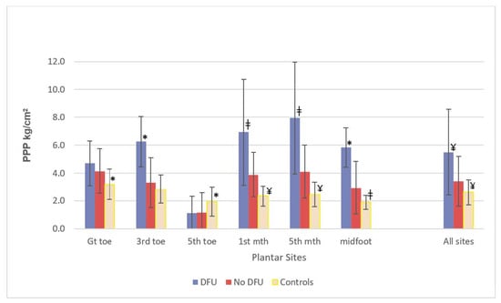 Comparison of mean PPP levels between different groups of plantar sites: diabetes sites with DFU history (total sites, n = 32); diabetes sites with no DFU history (total sites, n = 472); healthy control sites (total sites, n = 288). * p < 0.05’, ‡ p < 0.01, ¥ p < 0.0001, Group vs. No DFU group.