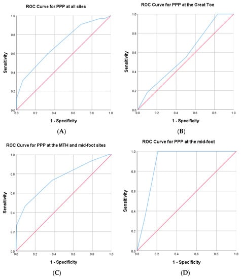 Logistic regression analysis models were constructed to assess the predictive value of PPP cut-off values for identifying DFU history for diabetes plantar sites only (odds ratios equate to relative risks when outcomes are < 10%). Receiver operator characteristic (ROC) curves were used to generate performance thresholds for PPP and examine the sensitivity/specificity of these thresholds at different plantar sites. All individual plantar sites were considered to be independent of sites on the same or other foot for each participant, based on evidence from prior research [] and the present study. Statistical analysis was conducted using SPSS Version 25 (IBM, Chicago, IL, USA).