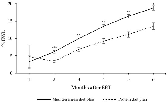 In addition, we observed significant differences in weight-loss effectiveness (expressed as %EWL) between patients who followed a Mediterranean diet plan versus those who followed a protein diet plan (Figure 1). Specifically, our data revealed that from the second to the sixth month after the EBT, %EWL was significantly higher among patients following a Mediterranean-style diet plan, compared with those following a protein diet plan (Figure 1). Note that after six months of treatment with EBT, patients under a Mediterranean-style diet plan lost 14.2% more EWL [95% CI: 3.0; 25.3] than those who followed the protein diet plan.