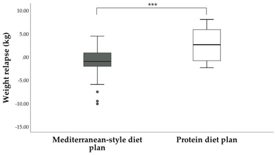 Regarding the sustainability of weight loss (Figure 2), we observed that the participants who followed a Mediterranean-style diet plan continued to lose weight three months after the end of the intervention (−1.2 ± 3.0 kg), while those who followed a protein diet plan gained, on average, 2.4 ± 3.3 kg (p < 0.001). Additionally, we noted a greater dispersion of weight relapse was observed in patients who followed a protein diet plan compared with those who followed a Mediterranean-style diet plan.