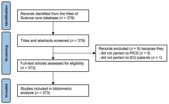 The Web of Science search yielded 379 articles, from which six articles were excluded as they did not pertain to ICU patients and/or PICS (Figure 1). Of the remaining 373 articles, 145 were original research articles, 103 reviews, 58 editorial articles or letters, 33 meeting abstracts, 19 protocol papers, nine case reports, five research letters, and one was a book review (Table 1).