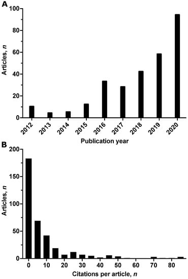 Articles were written by 1621 different authors from 793 institutions and 39 countries, with a mean number of 6.4 (SD 6.3) and a median number of 5 (IQR 3; 8) authors per article. The mean number of countries of origin was 1.4 (SD 1.0) per article, and the median number of countries of origin was 1 (IQR 1; 1) per article. On average, each article had 5.6 (SD 2.5) keywords, with a median of 5 (IQR 4; 6) keywords per article. The annual research output steadily increased from 11 articles in 2012 to 95 articles in 2020 (Figure 2A). Articles were cited 5415 times, with a mean of 14.5 (SD 57.3) citations per article and a median of 3 (IQR 0; 11) citations per article. Eight articles (2%) were cited >100 times, while 116 articles (31%) were uncited, and 67 articles (18%) were cited once or twice (Figure 2B).