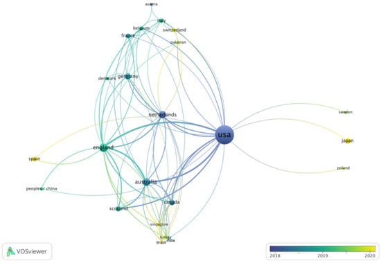 We identified 26 countries with at least three publications (Figure 3). As Greece, Portugal, and South Korea did not bear connections to the network, they were not displayed. The US lies in the network’s center and has collaborations with 21 countries, followed by the Netherlands (14 links), Australia (12 links), England (17 links), Canada (10 links), and Germany (nine links). With an average publication year of 2018, articles from the US and the Netherlands were published earlier than articles from other countries.