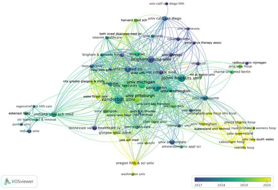 Collaborations between institutions among articles on post-intensive care syndrome. Co-authorship-based network. Lines between institutions indicate direct links (i.e., co-authorships). Thicker lines are indicative of stronger links (i.e., more co-authorships). The further two institutions are apart, the weaker is their relation. Colors indicate the average publication year of an institution’s articles. Institutions with at least four publications are shown. Five institutions were excluded as they did not show any connection with the network. Created using VOSviewer.