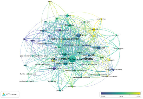 Keyword co-occurrence among articles on post-intensive care syndrome. Lines indicate direct keyword co-occurrences. Thicker lines are indicative for more direct keyword co-occurrences. The further two keywords are apart, the weaker is their relation. Colors indicate the average publication year of articles with the respective keyword. Keywords with at least five publications are shown. § Abbreviation for the keyword ‘post-intensive care syndrome (pics)’. Created using VOSviewer.