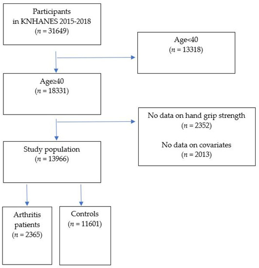 This cross-sectional observational study is based on the KNHANES from 2015 to 2018. As a nationally representative surveillance system, the KNHANES has been performed annually to assess the status of health and nutrition in the population of the Republic of Korea (henceforth ‘Korea’) since 1998 by the Korea Centers for Disease Control and Prevention (KCDC). The KNHANES participants were selected through multi-stage stratified clustered probability sampling. It was calculated using the sample weights assigned to the sample participants. The sample weights were constructed for sample participants representing the Korean population, taking into account the complex questionnaire design, questionnaire non-response, and post-stratification [17,18]. Participants diagnosed with OA or RA by a physician were involved in this study as patients with arthritis. As shown in Figure 1, out of 31,649 participants in the KNHANES, those aged ≥40 years were included. Patients with no data on the HGS or covariates were excluded. As a result, 13,966 individuals were enrolled in the study. We divided the participants into an arthritis group who were diagnosed with OA or RA and a healthy control group. This study was approved by the Institutional Review Board of the KCDC, and all participants provided written informed consent (No. 2018-01-03-P-A). For 2015–2017 KNHANES data, the Institutional Review Board approval was not required because the study was conducted for public welfare.
