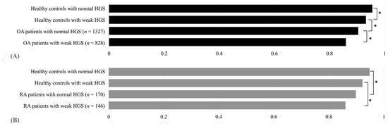 Table 3 compares the EQ-5D index according to HGS between the groups. In both arthritis and healthy control groups, the EQ-5D index was significantly lower in the participants with weak HGS. In the subgroup analysis, both OA and RA patients showed statistical significance in comparison with healthy controls using ANCOVA (p < 0.0001). In post hoc analysis, OA patients with weak HGS showed significantly lower QOL than normal HGS. However, there was no statistical significance in the difference of the EQ-5D index according to HGS in RA patients (Figure 3).