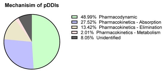 Out of 96 reviewed patient’ case records, 67 (69.7%) patients showed potential pDDIs (p < 0.001). 149 pDDIs were identified, out of which 31 were minor, 112 were moderate, and six were significant or severe (p < 0.001; Table 2). We found 49% pharmacodynamics interactions and 42.9% of pharmacokinetics interactions (Figure 2).
