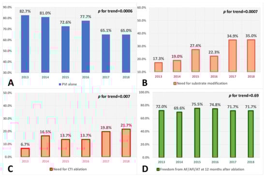 Myrda, K.; Buchta, P.; Błachut, A.; Skrzypek, M.; Gąsior, M. Temporary Trends Concerning the Extent and Efficacy of Atrial Fibrillation Ablation Using Radiofrequency Energy in a Polish Single-Center Experience. Medicina 2022, 58, 187. https://doi.org/10.3390/medicina58020187