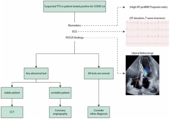 In case of suspected TTS in patients tested positive for COVID-19, basic tests are recommended. Typical biomarker profile is mild elevation in troponin with excessive NT-proBNP elevation reflecting minor myonecrosis and high cardiac wall stress. The use of POCUS is useful and helps to identify typical wall motion abnormality and exclude other conditions. If all these tests are within normal limits, TTS is unlikely. When the diagnosis is very likely based on the aforementioned tests, and the patient is in stable condition, exclusion of obstructive coronary artery disease using CCT is required. In unstable patients, invasive coronary angiography is the recommended next step.