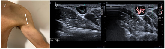 (a) A 21-year-old male with unilateral left arm adenopathy (white arrow) noted four days after receiving the first dose of the Moderna COVID-19 vaccine in his left deltoid muscle. (b) B-mode sonogram image shows ovalar lymph node with asymmetric cortex and dislocate hilum. (c) SMI image shows central and peripheral vascularization.