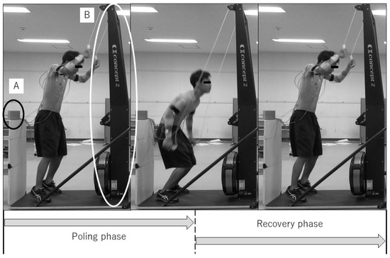 Measurement environment and phase division. (A) the transmitter of the electromagnetic tracking device; (B) the ski ergometer.