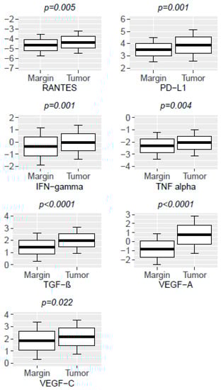 We found significantly higher levels of RANTES, PD-L1, IFN-γ, TNF-α, TGF-β, VEGF-A, and VEGF-C in the tumor in comparison with the margin (Table 2 and Table 3, Figure 1 and Figure 2)