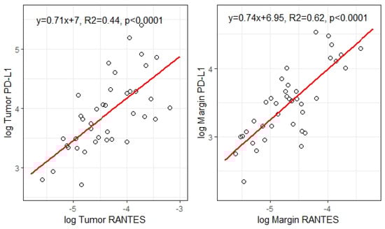Graphical representation of linear regression results assessing correlations between log RANTES and log PD-L1, respectively, in tumor and margin tissue.
