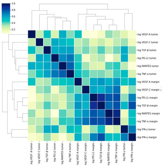 Furthermore, the tumor levels of RANTES correlated significantly with those of PD-L1, TNF-α, TGF-β, VEGF-A, and VEGF-C. The margin levels of RANTES were significantly associated with the margin levels of all the proteins investigated—PD-L1, IFN-γ, TNF-α, TGF-β, VEGF-A, and VEGF-C (Figure 3, Table 4).