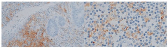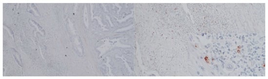 Immunostaining for PD-L1 ((Opta Tech 2200 Camera, magnification 10× and 60×). Cytoplasmatic positive IHC staining for PD-L1 in tumor-infiltrating lymphocytes.