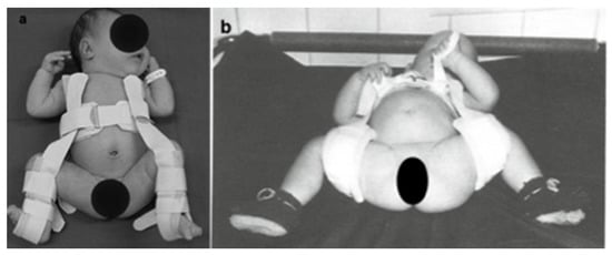 (a) is current from our setting. This is how the Pavlik harness is applied in human position. (b) Instead of the Pavlik harness, a Daimler bandage is used. The difference between the human position and the Lorenz position is clearly visible in the abduction up to more than 90° [].