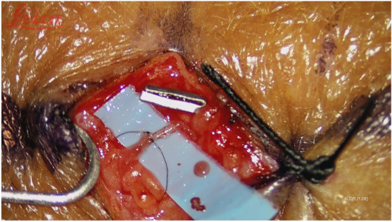 Lymphaticovenular anastomoses were performed following axillary or inguinal complete lymph node dissection. We decided to perform this treatment after the completion of adjuvant radiotherapy. All the procedures were performed under general anesthesia. Antibiotic prophylaxis was administered before surgery. The lymphatic ducts were mapped before surgery with indocyanine green (ICG) fluorescent imaging, following a distal-to-proximal sequential injection technique; a total of 2 cc of ICG was injected into the second and third interdigital space [15]. Three (for lower limb) or four (for upper limb) skin incision lines of approximately 3 cm in length near the lymphatic vessels were marked along the limb. After skin incisions, under microscope magnification (20–30×), lymph ducts were identified, and their proximal ends were ligated. Nearby subdermal veins with an adequate caliber, which should be less than 0.8 mm if performing termino-terminal anastomosis, were identified, and their distal ends were ligated. The anastomoses were, thus, performed between the proximal end of the vein and the distal end of the lymphatic duct at each preoperatively identified site. The microsurgical technique is the same standard technique for the LVA procedure [16]. Lymphatic vessels were sutured to the vein end to end with single stitches (nylon 11-0), and the anastomosis was checked for patency; we routinely confirmed patency in all cases with ICG lymphangiography (Figure 1 and Figure 2). The procedure typically lasted approximately two hours. At the conclusion of the procedure, the treated limb was immediately compressed with a short-stretch compression bandage and successively with compression garments for 3 months.