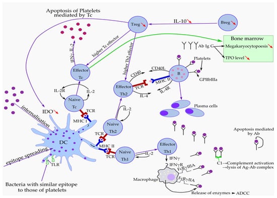 Cells belonging to the innate immune response, through their mode of action, have an important role in the autoimmune response, such as that in ITP. Such cells, including DCs, macrophages together with B cell lymphocytes, have the role of scanning the environment, internalizing, processing, and presenting foreign antigens to lymphocytes through proteins belonging to the major histocompatibility complex [,]. DCs are the most efficient APCs [] and different studies have shown their impairment in ITP []. In ITP, dendritic cells can phagocyte apoptotic platelets and subsequently stimulate naïve-specific T cells. Even though the phagocytic abilities of DC are similar in ITP and healthy controls, the expression of co-stimulatory molecules CD80 [] and CD86 is higher, and they produce larger amounts of IL-12 than do controls []. Besides antigen presentation, TLR-mediated recognition of infectious agents by DC has been demonstrated to have a relationship with ITP. For example, TLR-4 that binds LPS, a Gram-negative bacterial endotoxin, was shown to be related to LPS-induced ITP [,]. TLR-7 was also shown to be related to B cell proliferation and therefore to anti-platelet antibody production in vitro via BAFF (B cell-activating factor of TNF family) production []. In addition, the so-called cryptic epitopes, normally not exposed in a self-structure, but which might become expressed and recognized by the immune system in special situations, such as an infection, have been described. The processing of these self-structures in the APCs produces a certain number of new epitopes, a process called epitope spreading, that can perpetuate and amplify the inflammatory response []. The T cell clones that interact with these cryptic epitopes might escape negative selection in the thymus when these self-determinants are present under a certain threshold concentration. For example, in ITP, platelets coated with anti-GPIIbIIIA are internalized and together with other platelet glycoproteins, such as GPIb/IX, are degraded inside the APCs and lead to the formation of a multitude of cryptic epitopes. Consequently, the APCs presenting these novel peptides, along with high levels of co-stimulatory molecules, determine the activation of naive T cells against the above-mentioned self-structures; in other words, the epitope spreading, mediated by APCs, has an important role in the generation and perpetuation of ITP [].