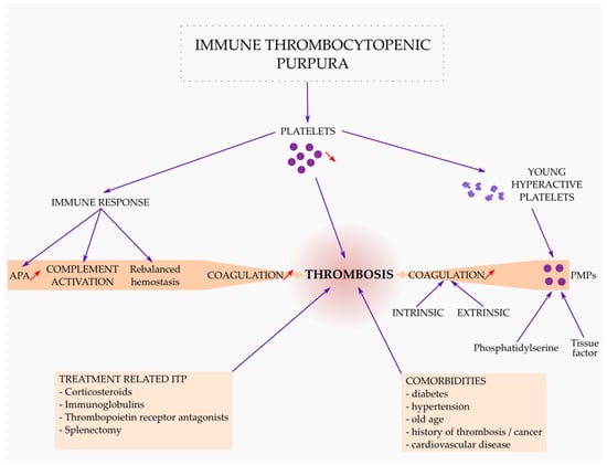 The main mechanisms involved to increase the risk of thrombosis in immune thrombocytopenic purpura (ITP). Thrombosis in ITP is related to the pathophysiology of the disease (young hyperactive platelets, PMPs—platelet microparticles, rebalanced hemostasis, complement activation, endothelial activation, APA—antiphospholipid antibodies, inhibition of natural anticoagulants), ITP treatment and other comorbidities.