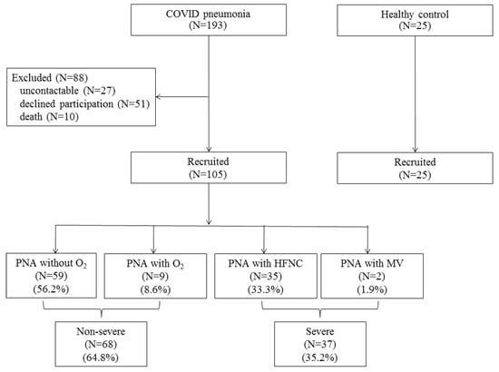 During the phase 3 (April–May 2021) outbreak of COVID-19 in Chiang Mai, 193 patients with COVID-19 pneumonia were admitted to our hospital and ten patients (5.2%) died during hospitalization. One hundred and five discharged patients came for follow-up and participated in this study, with a mean age of 35.6 ± 15.7 years and with 54 males (51.4%). These patients were categorized into two groups: the non-severe pneumonia group, N = 68 (pneumonia with no oxygen therapy, N = 59, or treated with low-flow oxygen cannula, N = 9), and severe pneumonia group, N = 37 (pneumonia treated with high-flow nasal cannula oxygen (HFNC), N = 35, or mechanical ventilator, N = 2). Twenty-five age- and gender-matched healthy control subjects were also enrolled (Figure 1). The demographic data of the study population are shown in Table 1. The non-severe pneumonia patients were younger than the severe pneumonia patients, while the severe pneumonia patients had a higher BMI and had more cardiovascular co-morbidities, where hypertension was the most common (N = 16, 43.2%), compared to the non-severe pneumonia patients. More data are shown in Table 1.