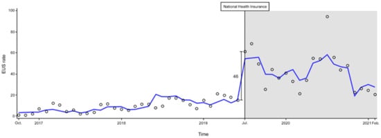 The results of the segmented regression analysis of interrupted time series data by NHI expansion are shown in Table 2 and Figure 2. Before the expansion of the NHI, the EUS rate had gradually increased (p < 0.001). After the expansion of the NHI, there was a significant change in level such that the EUS rate immediately increased from 15 to 61 (p < 0.001). However, the change in slope was significantly decreased (p < 0.001). The EUS rate also increased significantly in the presence of physician participation in intensive POCUS training (p < 0.001).