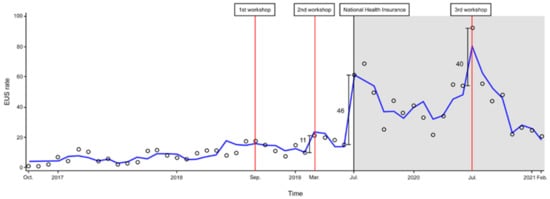 The results of the segmented regression analysis of interrupted time series data by four interventions (three workshops and NHI expansion) are shown in Table 3 and Figure 3. The first workshop did not show a significant change in the level and slope of the EUS rate. However, the second workshop, expansion of NHI, and the third workshop were associated with a significant change in the EUS rate. Among them, the difference in the EUS rates before and after NHI expansion was estimated to be the largest. However, after the third workshop, the change in the slope of the EUS rate decreased significantly (p = 0.004). In addition, the EUS rate increased monthly until the first workshop (p = 0.013) and increased significantly in the presence of physician participation in intensive POCUS training (p < 0.001).