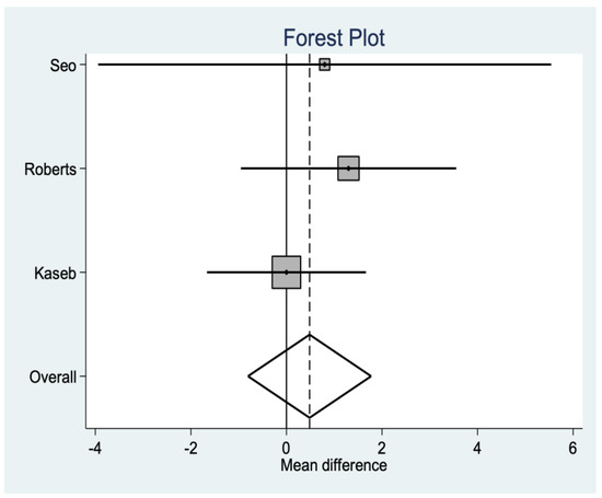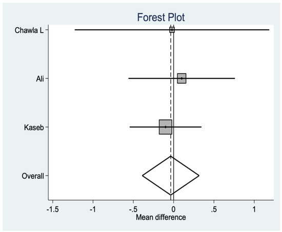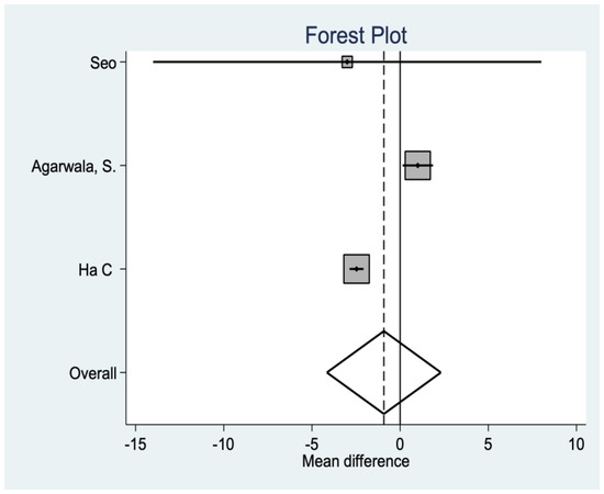 Radiological variables are not very constant throughout the literature. In this case, both the Insall ratio and the patellar tilt are found in three studies that show that there are no statistically significant differences between groups (Figure 9 and Figure 10).