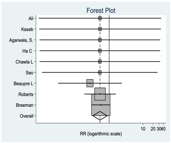 Data are reported in this regard in nine studies, observing a significant difference in favor of the no-resurfacing group (p = 0.0137). In other words, this group has a higher risk of revision than the resurfacing group (Figure 7).
