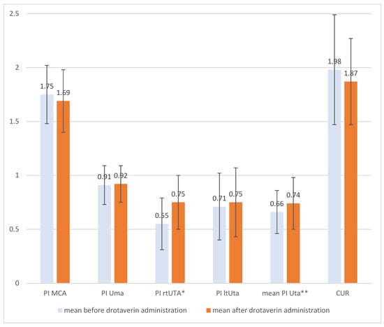 Among all of the patients, there were no statistically significant differences between the pulsatility index (PI) assessment of the umbilical artery, fetal middle cerebral artery, and left uterine artery before drotaverin administration and 90–120 min after oral intake. There were statistically significant differences between the Doppler assessment of the right uterine artery and the mean of the left and right uterine arteries (Figure 1). The PI in those cases was higher after drotaverine administration, but the result still remained within the normal range.