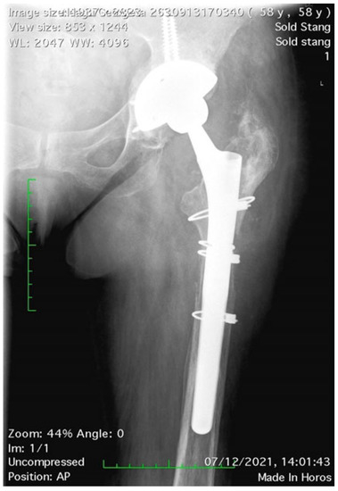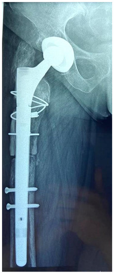 Adapting the shape of the trochanteric region of the OBF to the lateral profile of the prosthesis had to be performed very carefully using thorough debridement. The OBF was fixed using two or three Dall–Miles cables, adequately tensioned, depending on the length. No difference was found between two- and three-cable fixation in terms of the peak force, stiffness of the construction, or angular or axial displacement of the osteotomy [10,11]. Recently, numerous other techniques for fixing the OBF have been described using either metal wires or cables arranged in different configurations or synthetic non-metallic materials. In all these variants, the reported results were good [12,13,14].